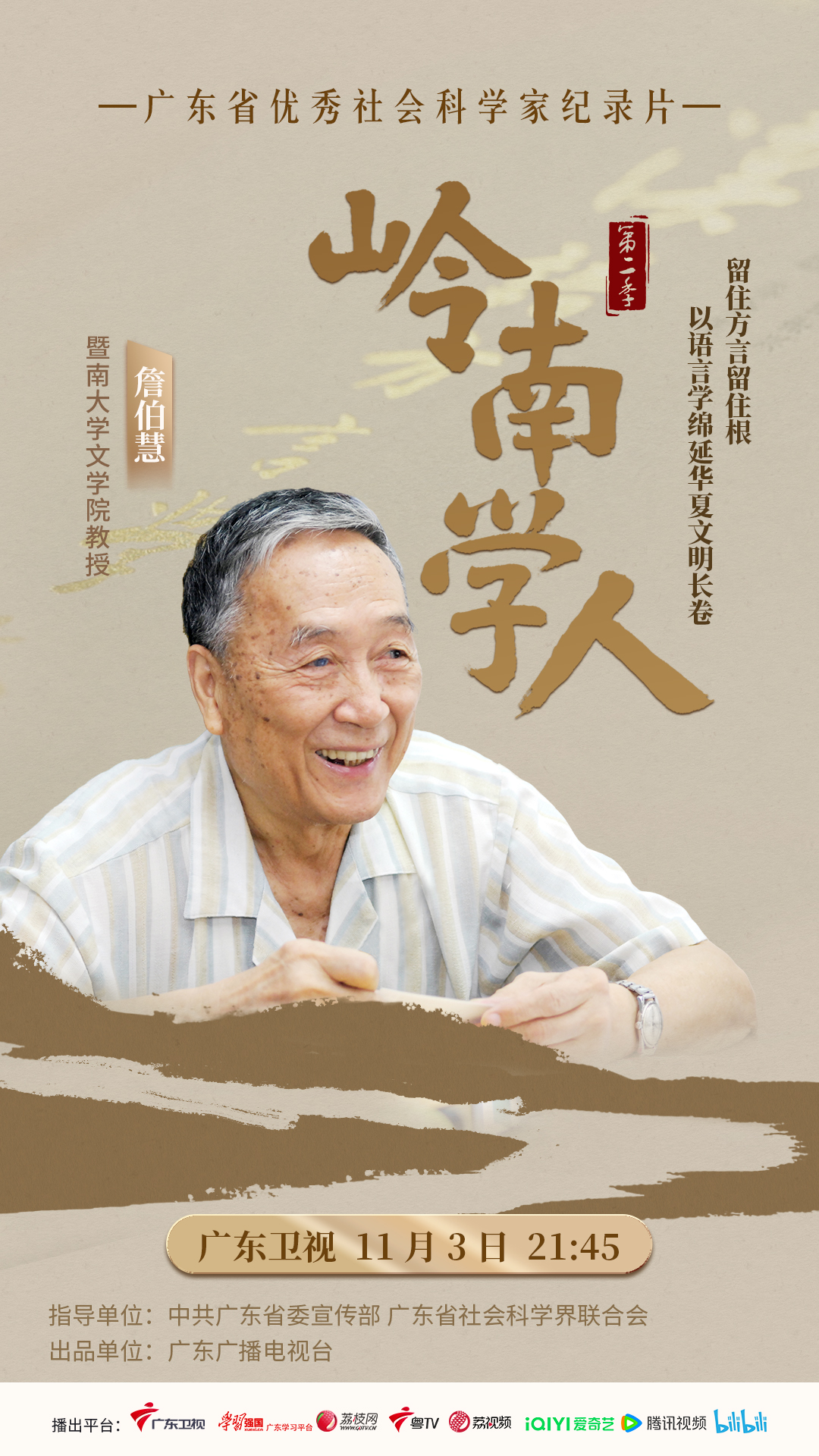 为深入学习贯彻习近平文化思想,扎实推进更高水平文化强省建设,生动展现广东哲学社会科学工作者的学术贡献与时代风采,广东省委宣传部联合广东省社会科学界联合会组织广东广播电视台拍摄制作广东省优秀社会科学家专题纪录片《岭南学人》。2024年12月,《岭南学人》第一季隆重推出,社会反响热烈。2025年10月,第二季正式上线,本季节目聚焦广东省哲学社会科学领域10位代表性人物:李锦全、胡经之、詹伯慧、曾宪通、何自然、毛蕴诗、梁桂全、莫雷、吴承学、蓝海林,他们分别来自哲学、文学、心理、经管等社科领域。节目以细腻纪实的镜头,深入呈现岭南学人潜心学术、求索真理的动人故事与他们的深邃思想。